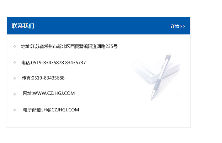 地址:常州市新北區友邦商務大廈1幢16、17層  電話:0519-85101652  傳真:0519-85112595  郵編:213022  網址:www_cz-jiayue_cn.gzhzx.com  郵箱:xiajifengaa@163.com